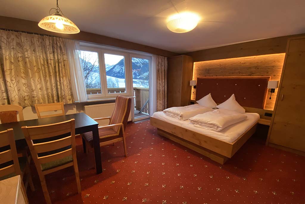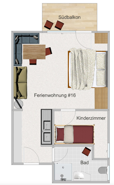 mit separatem Kinderzimmer (Stockbett), Du/WC, Wohnecke, Küche, Sat-TV, Telefon, Mietsafe, eigener Südbalkon mit Blick auf die Tannheimer Berge